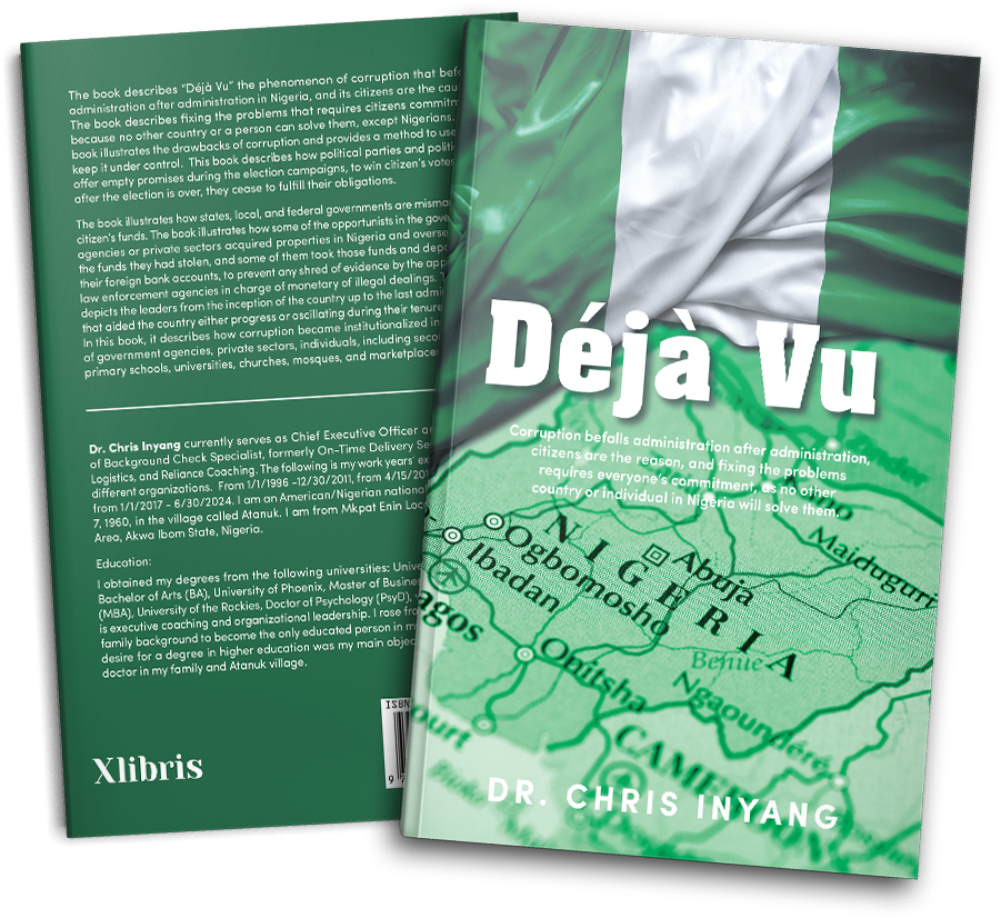 The book describes “Déjà Vu” the phenomenon of corruption that befalls administration after administration in Nigeria, and its citizens are the causes. The book describes fixing the problems that requires citizens commitment because no other country or a person can solve them, except Nigerians. This book illustrates the drawbacks of corruption and provides a method to use and keep it under control. This book describes how political parties and politicians offer empty promises during the election campaigns, to win citizen’s votes, and after the election is over, they cease to fulfill their obligations.